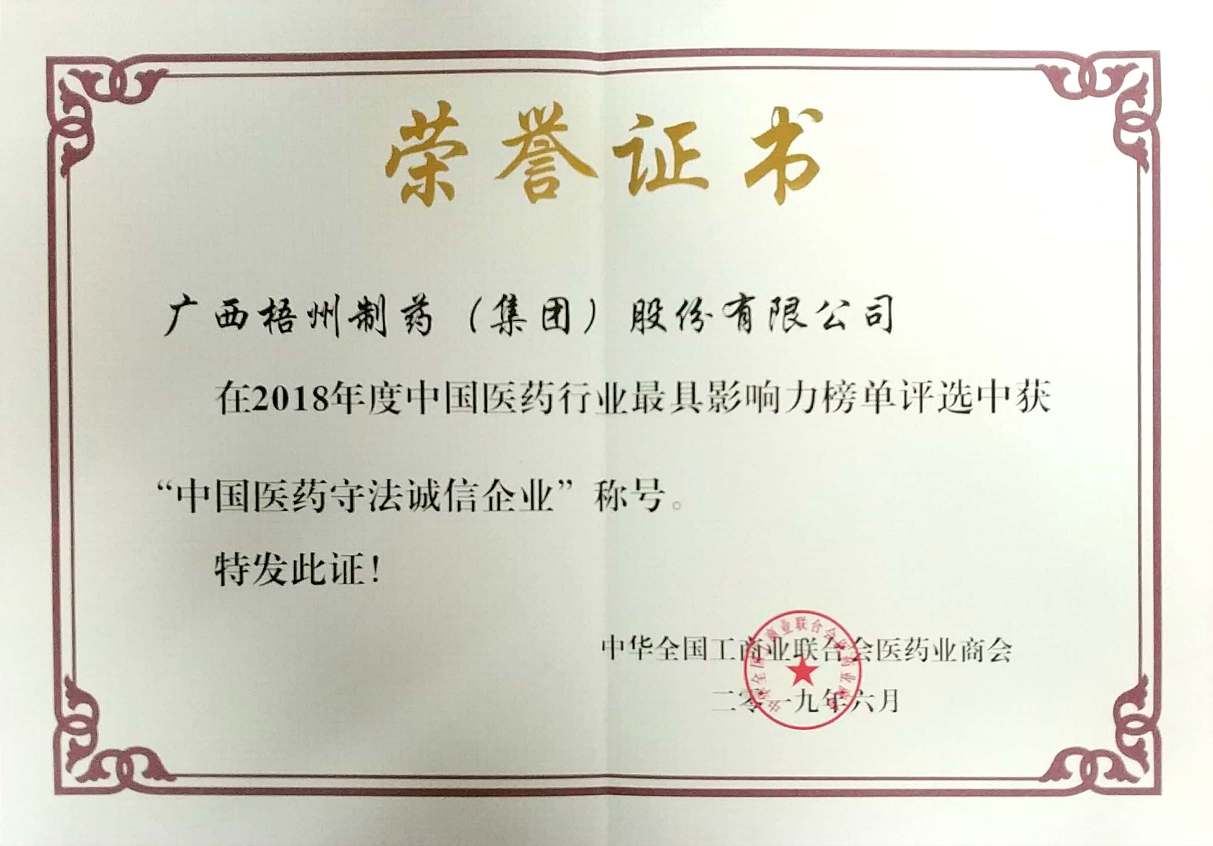 在2018年度中国医药行业最具影响力榜单评选中获“中国医药守法诚信企业”称号。