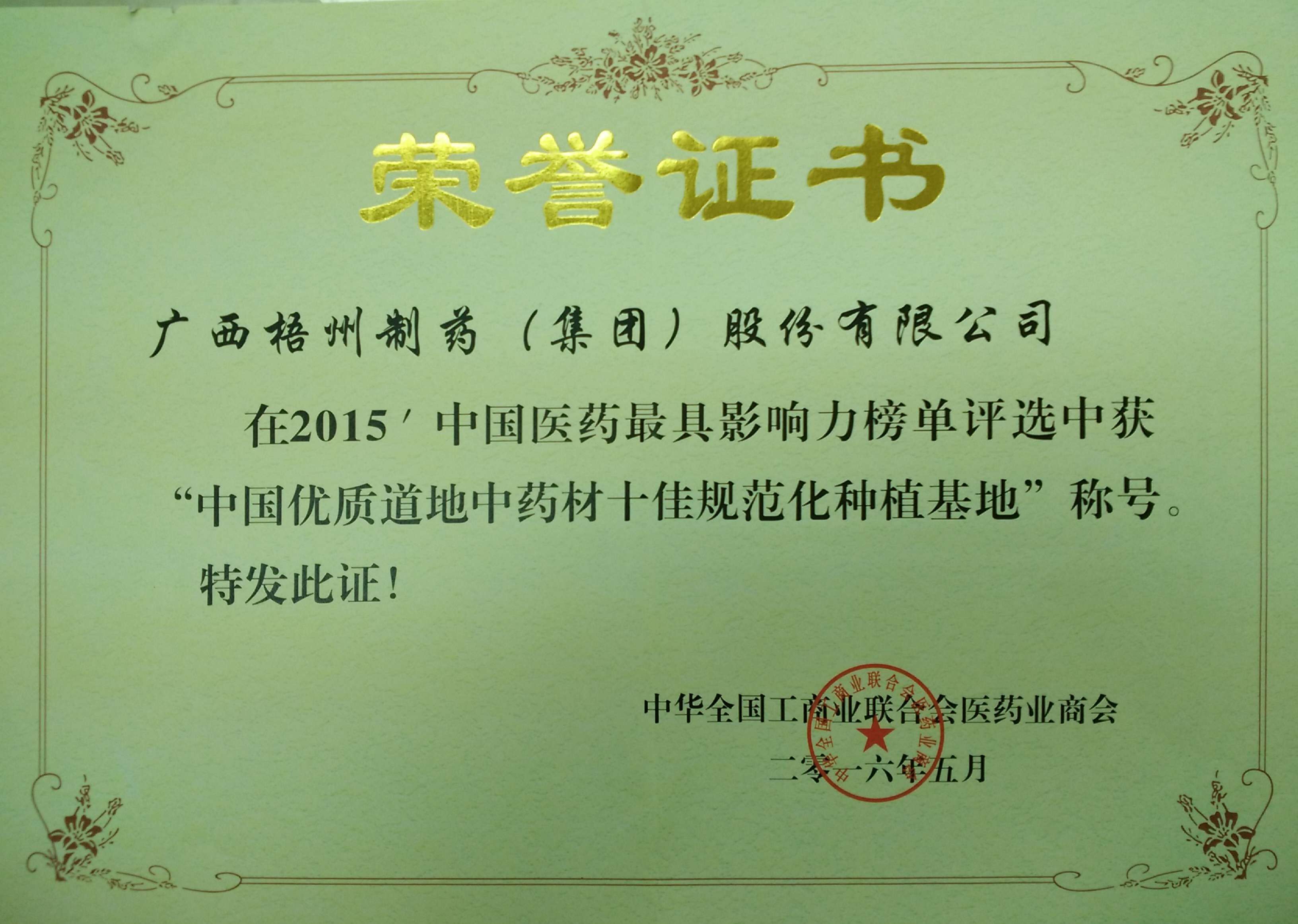 荣获2015年度中国优质道地中药材十佳规范化种植基地称号