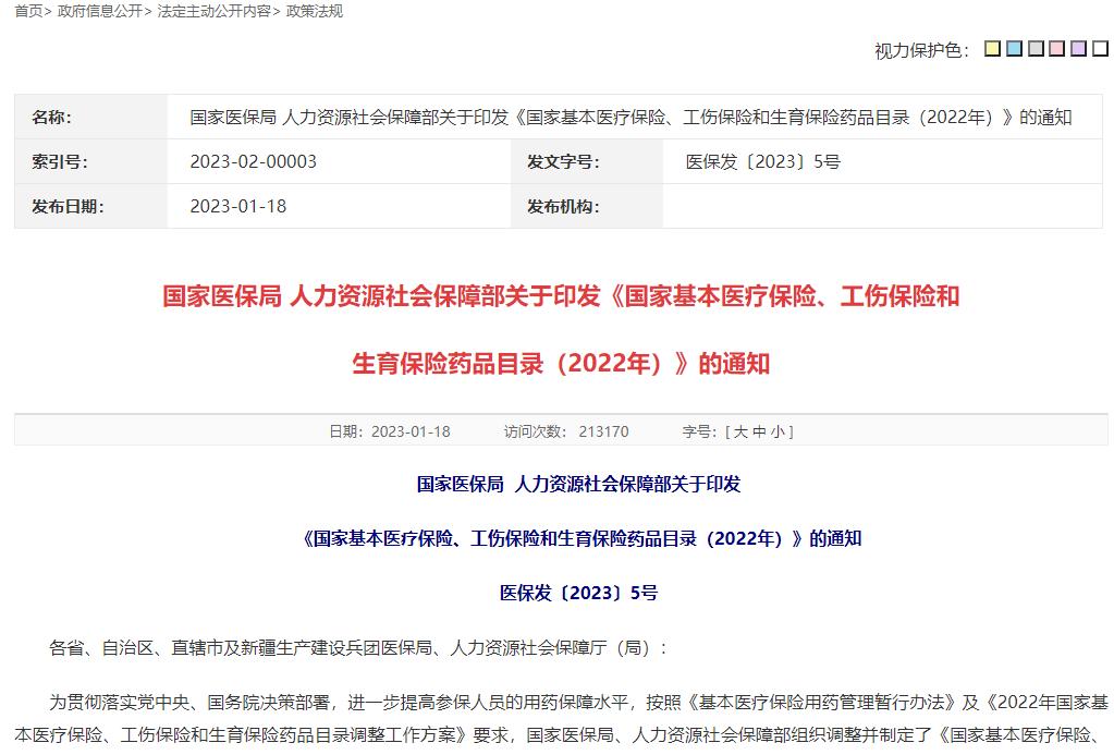 2023年1月18日,国家医疗保障局正式对外公布2022年《国家基本医疗保险、工伤保险和生育保险药品目录》,其中威廉希尔williamhill公司独家生产的国家基药——注射用血栓通(冻干)由2021年“限二级及以上医疗机构的中风偏瘫或视网膜静脉阻塞患者”调整为:“限二级及以上医疗机构”。并于2023年3月1日起正式执行。