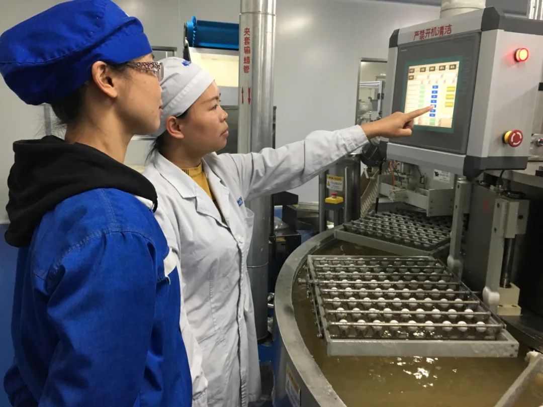 面对这个问题,雷洁萍和团队加快技术改造创新,引进两条大蜜丸全自动扣壳、全自动蘸蜡设备联动生产线。反复调试入壳机扣壳的吻合度与力度,最终实现机械设备间的联动生产,操作人员由100余人压降到20余人,日产量翻了10倍,大幅提高产能及生产效率,缩短了生产周期。