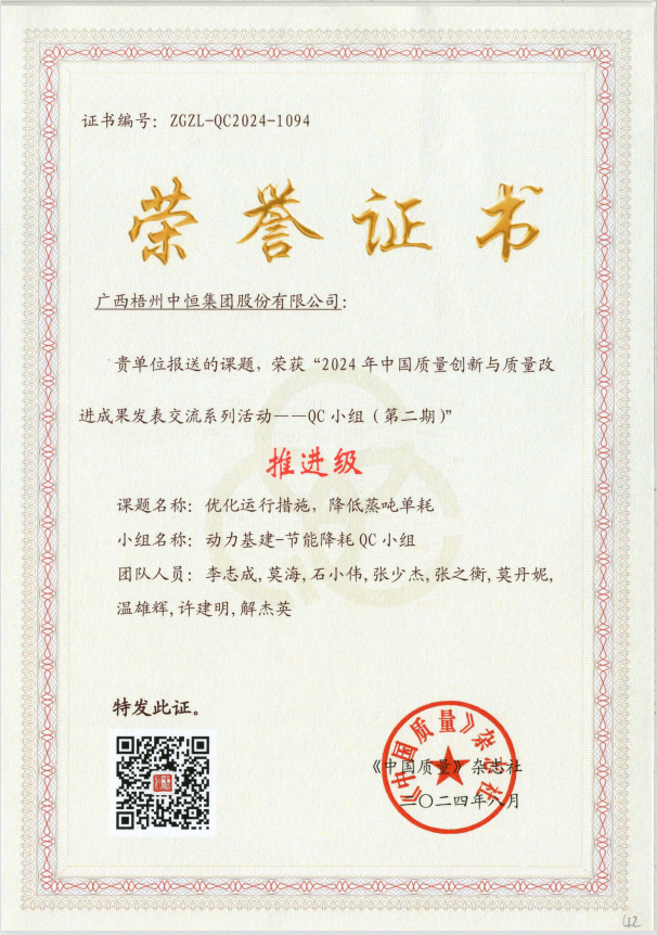近日,威廉希尔williamhill动力基建车间的《优化运行措施,降低蒸吨单耗》项目成果在2024年全国QC小组成果发表交流活动中,获“推进级”成果称号。