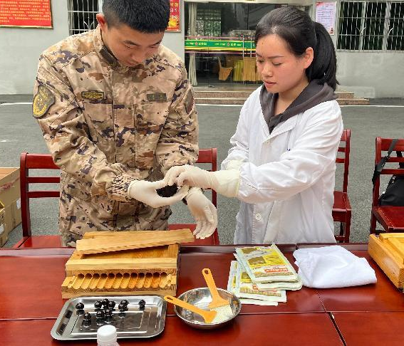 戥子、杵臼、搓丸板,这些平日很少接触到的中药传统制药工具,触发起武警官兵们强烈的好奇心和探知欲,兴致勃勃地尝试操作,纷纷参与体验中华跌打丸制作技艺,从制丸条到成功搓制成丸,每一道工序无不感受着非遗文化独特的魅力。